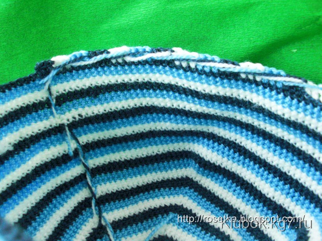 Нижний край кепки решила украсить вот такой полоской, чередуя цвета. При этом при смене нити последний приём провязывания столбика с накидом выполняла нитью нового цвета.