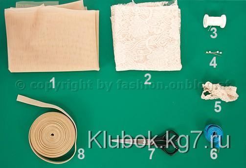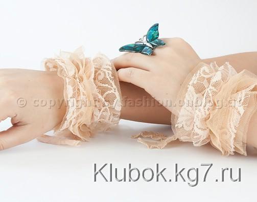 Как видите, здесь помимо кружев, еще используется тюлевая ткань. Также нам понадобится клей, браслет и дополнительный декор - у автора это пуговица и в тон серединке полоска голубого кружева. Исполнение очень простое.