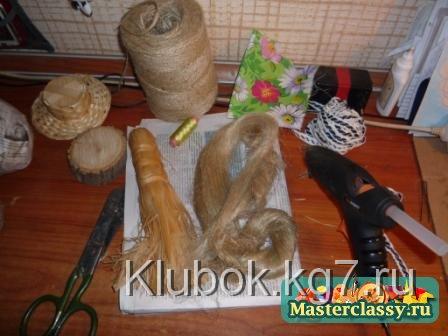1 хвостик льна, можно еще паклю, джут, сизаль, хоть нитки шерстяные, кому что