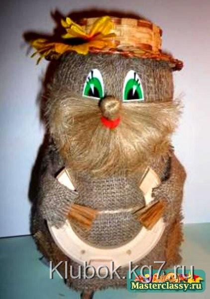 3. теперь берем мешковину 32*32, в центр кладем обмотанную головку и очень плотно обтягиваем. Завязываем шпагатом. Это лицо вашего домовенка! аккуратнее! Хвостик обрезаем, как на фото