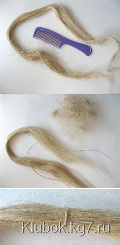 пополам, завязываем часть для головы, но немного 1-1,5 см. Держа очёс в левой