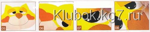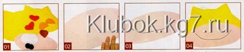 Счастливый солнечный кот сшит вручную из фетра. Использован жёлтый, оранжевый, красный, белый и чёрный фетр. Сделать выкройку и вырезать все детали. На мордочке вышить ротик чёрными нитками. Мордочку пришить к одной из частей головы.