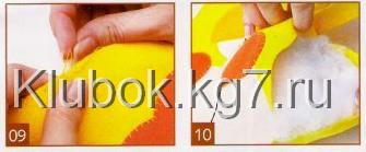 Сшить две части головы, оставив отверстие для наполнения синтопоном. Аккуратно разместить синтопон и зашить подушку.