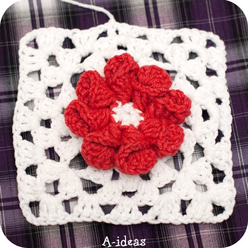 12. Следующий круг тоже понятнее читать по картинке. На этом можно и закончить квадратик, тогда плед будет похож на тот вариант, который меня вдохновил изначально — большие цветочки и чуть-чуть только видно белую основу из-под цветка. Но скажу сразу, что в таком варианте квадратик будет достаточно маленьким, если не использовать толстые нитки изначально.