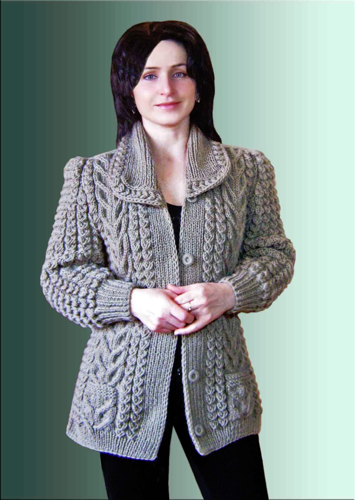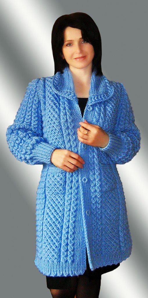 Hip circumference 104 cm. Product length 67 cm. You will need about 1400 g of bulky acrylic or half-wool yarn (150 m/100 g), needles No. 3.5 — 4, buttons (or plastic rings for handmade buttons). Author of the work — Natalia Lok