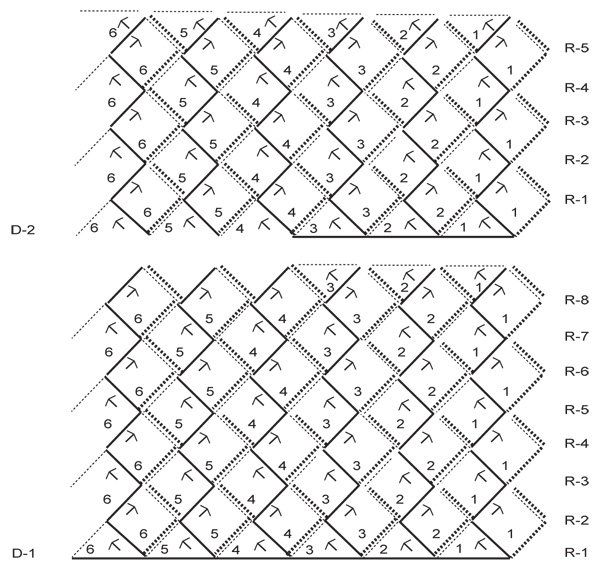 Work row 4 to row 8 with Whole Squares in the same way as before. See D-1 for rows, squares and knitting direction.