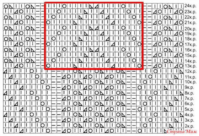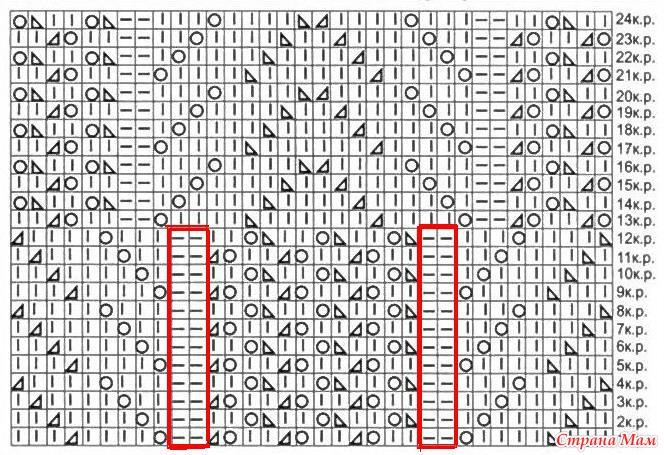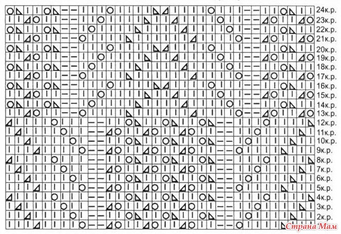 Нередко в схемах можно встретить опечатки, что особенно досадно для начинающих вязальщиц. Однако, если хорошенько разобраться в узоре, то можно легко взять за основу любую из схем. (В схеме вертикальной галочкой обозначаются в лицевых рядах – лицевые петли, в изнаночных рядах – изнаночные петли).