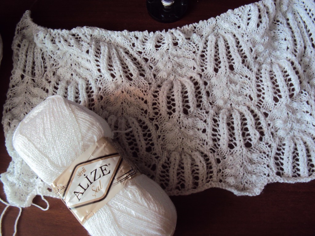 3-й ряд: 2 лиц, накид, 4 лиц., 2 лиц. вместе с протяжкой, 2 лиц., 2 лиц. вместе, 4 лиц., накид, 2 лиц.