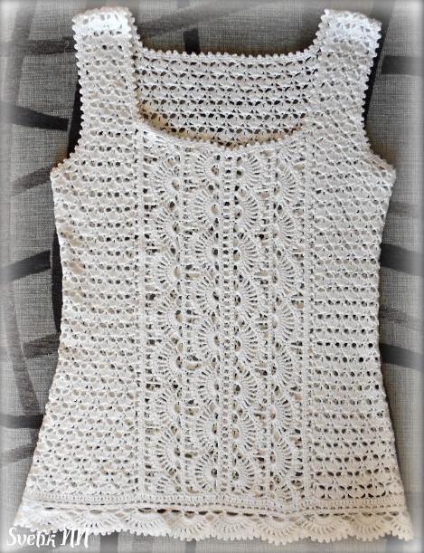 В процессе вязания ,эта центральная вставка у меня удлинилась до 39 см, т.е. на 3 см выросла. Поэтому думаю если хочется покороче маечку можно убрать из рисунка 1-2 секции (раппорта). Здесь 1-2 арочки. Или взять нитки потоньше.